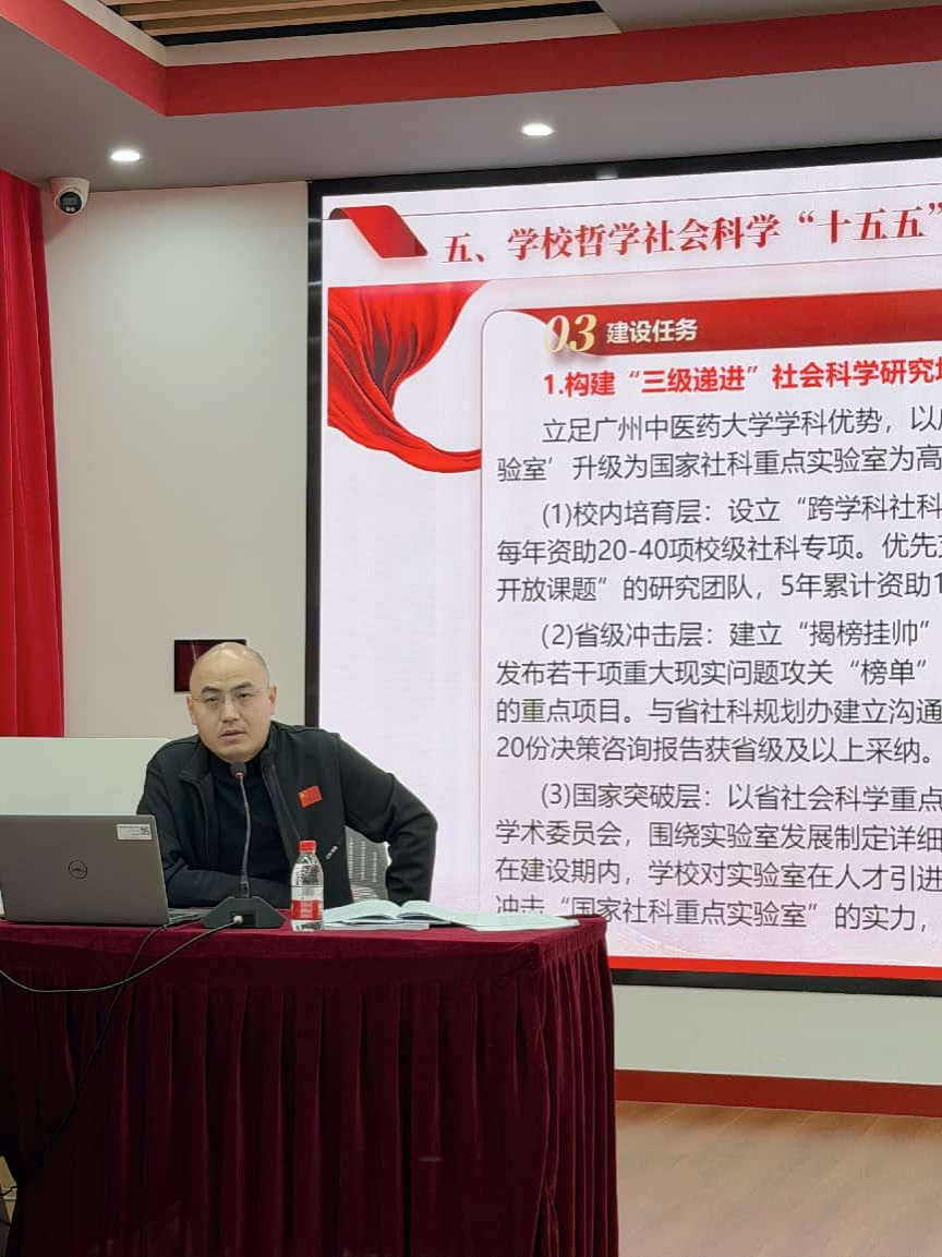 龚建文书记作学院发展主题报告,系统回顾了学院2025年在党建、学科建设、科研教学等方面取得的进展,汇报了学院统筹经费的使用情况,并深刻剖析了当前发展面临的主要挑战与不足。通过分析2025年目标管理考核,围绕学院未来工作,龚建文重点解读了《学校哲学社会科学“十五五”规划》,并部署了2026年五大重点工作:一要深化“两个结合”,着力提升学科整体水平与人才队伍建设;二要深入阐释弘扬“铁涛精神”,强化特色价值引领;三要深化思政课改革创新,全力打造育人品牌;四要推进医学人文研究院运行,建好建强医学人文二级学科博士点,系统性开展医学人文研究与教育;五要做强广州市青年马克思主义理论人才培养研究重点基地等平台建设,争取打造人文社科智库,增强社会服务能力。他号召全院教职工以“跃马扬鞭”的劲头,共同推动学院高质量发展。