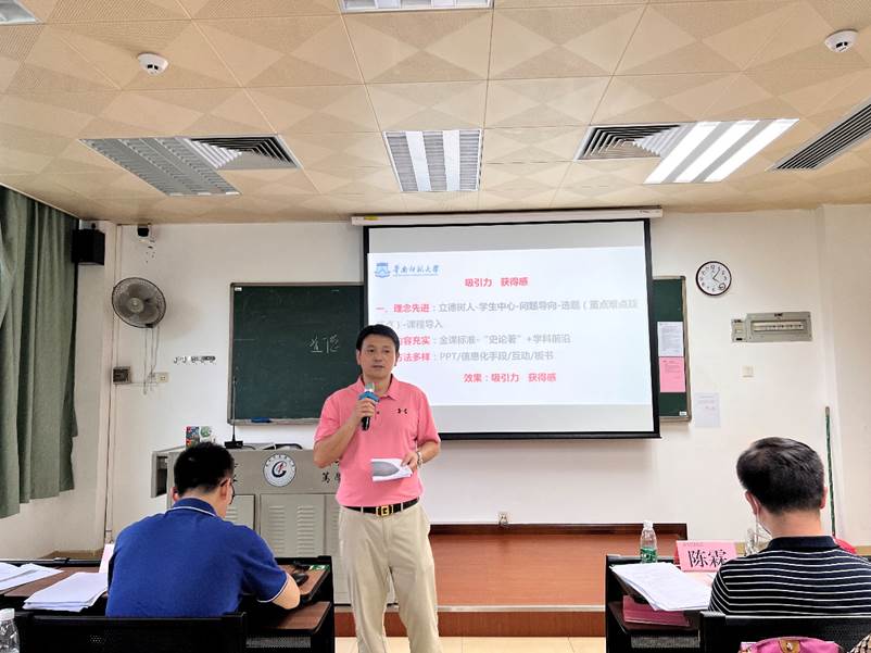 比赛结束后,张永刚教授从“吸引力”、“获得感”两个关键词入手,分享经验。第一、理念先进。要时刻坚持立德树人的根本,以学生为中心,以问题为导向,侧重重点难点疑惑点,同时也要注意课程导入方式。第二、内容充实。要紧靠金课标准,“史论著”结合,并紧跟学科前沿。第三、方法多样。要灵活运用简约清晰的PPT、信息化手段、多样化板书等与学生互动,以达到更好的教学效果。