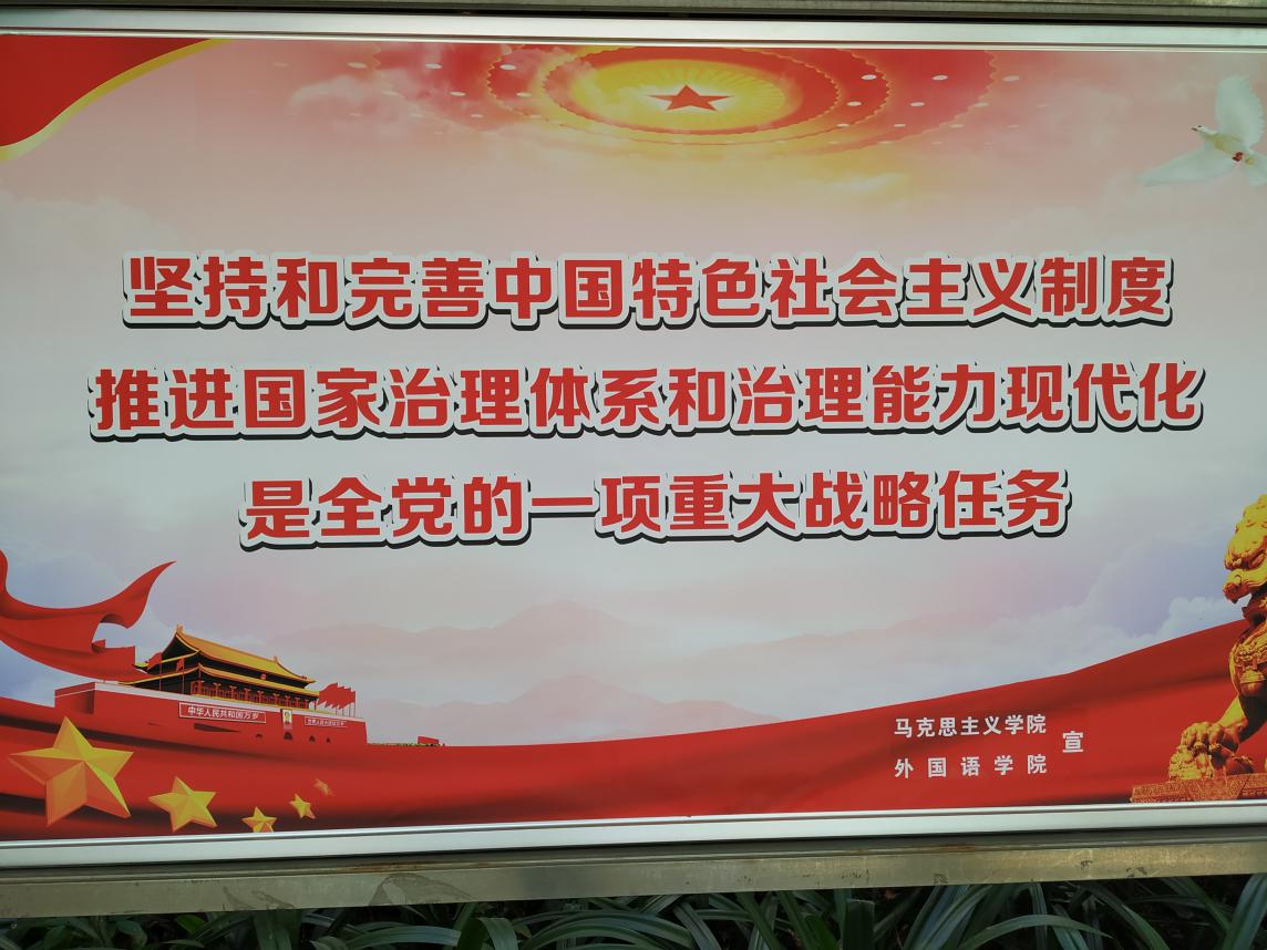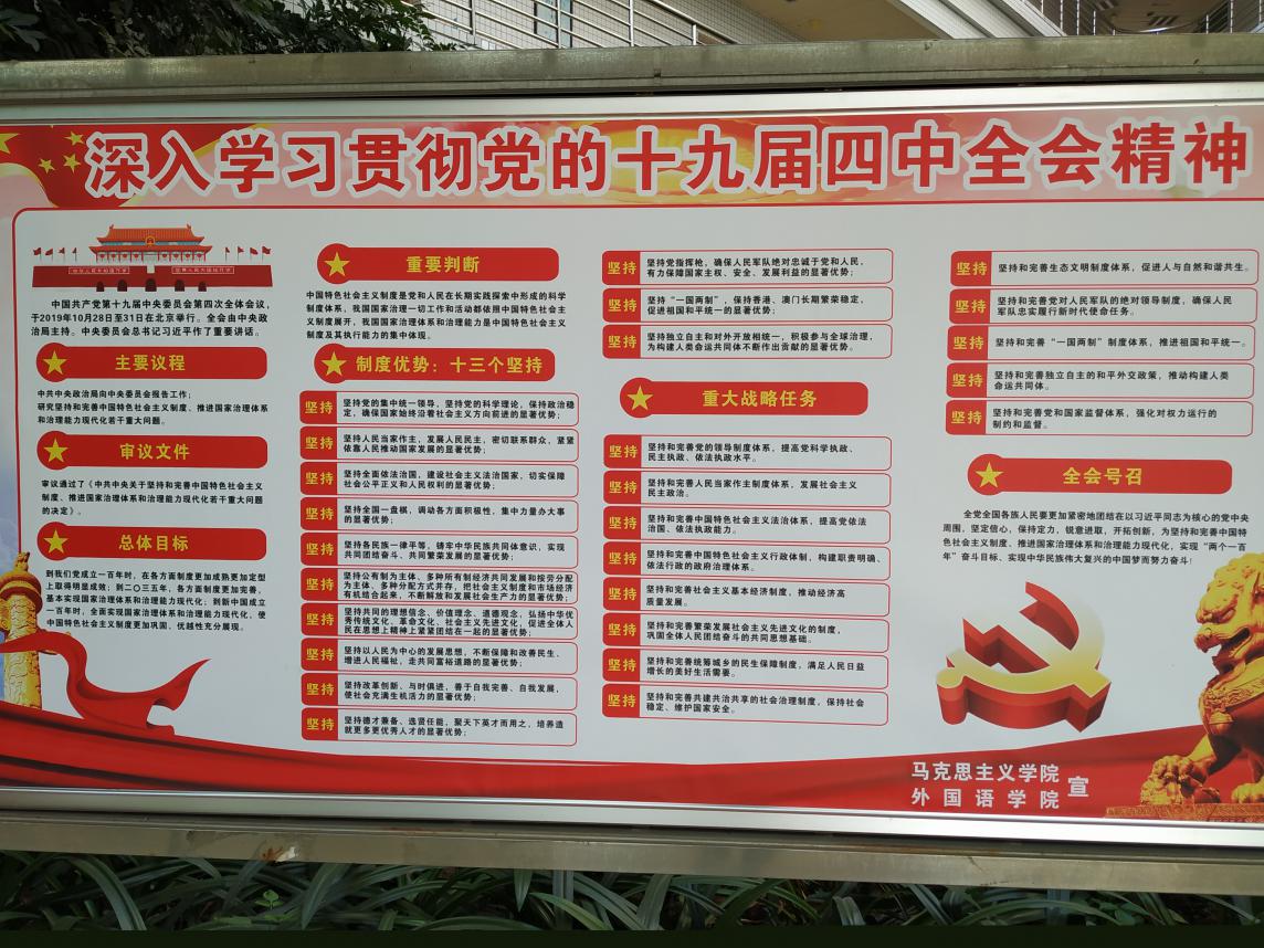 为广泛宣传党的十九届四中全会精神,william威廉中文官网制作了两张精美海报张贴于人文楼一楼大厅,海报详细介绍了十九届四中全会的主要议程、会议审议文件、一个总体目标、一个重要判断、十三个坚持、今后的重大战略任务和全会号召。