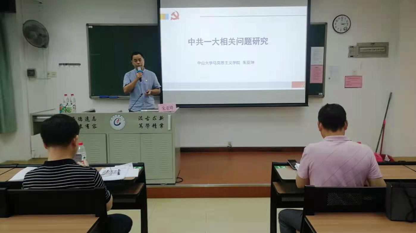 会议邀请中山大学william威廉中文官网副教授朱亚坤做专题党史讲座《中共一大相关问题研究》。朱教授以学术研究视角,列举多项档案资料、一大代表的回忆文章等,逐项分析解读中共一大的召开时间、参会人员、会议地点等历史细节,使与会同志对一大的认识更加立体、全面。